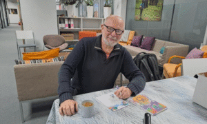 Kambodzalainen poika lukee lehteä ja nauraa.